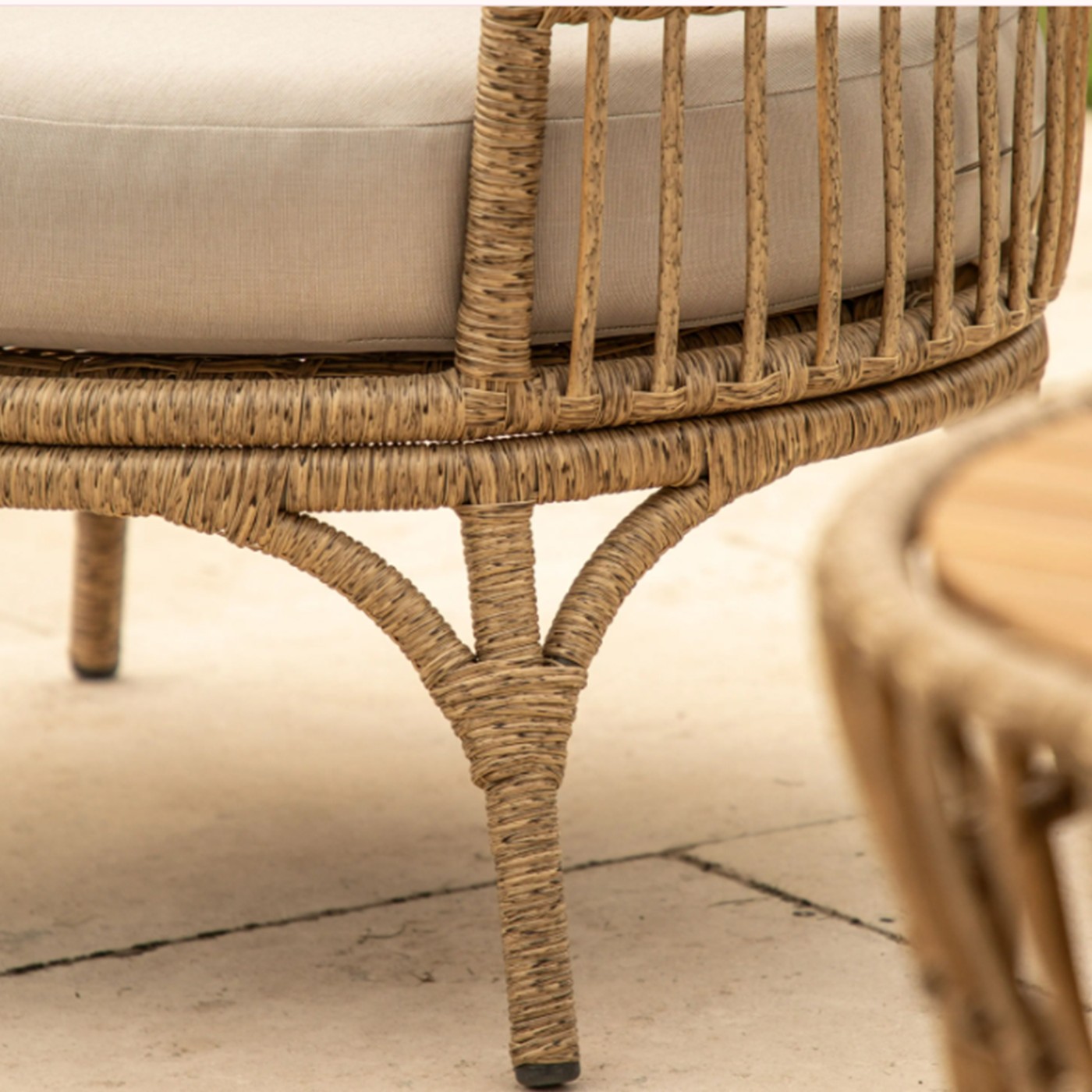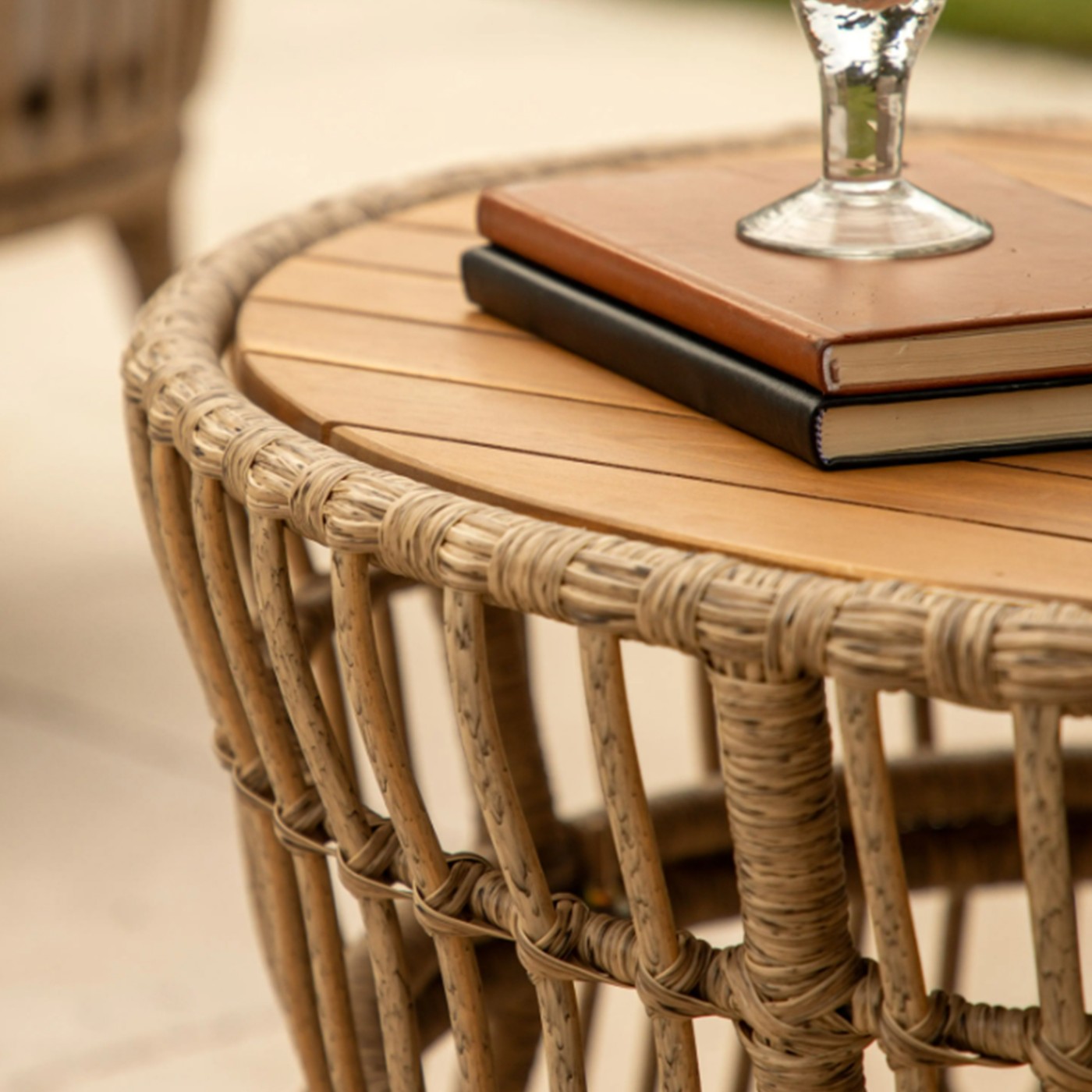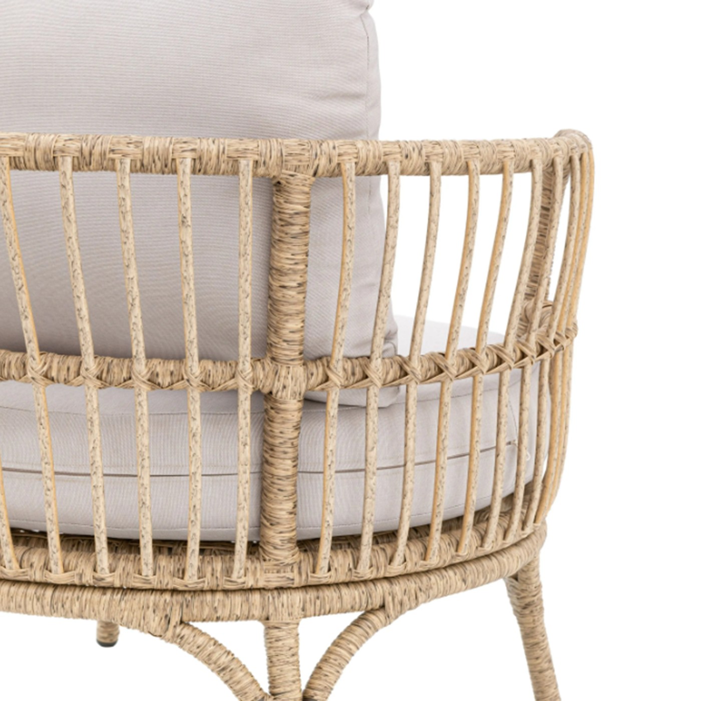 Boho inspired for the ultimate chilled out summer this lounge set features 2 stunning woven look armchairs, a 2 seater sofa and a round Acacia wood topped coffee table. The steel frames are wrapped with 9mm brown weaving for a natural look that will last outdoors, added comfort comes from the soft grey UKFR foam cushions.