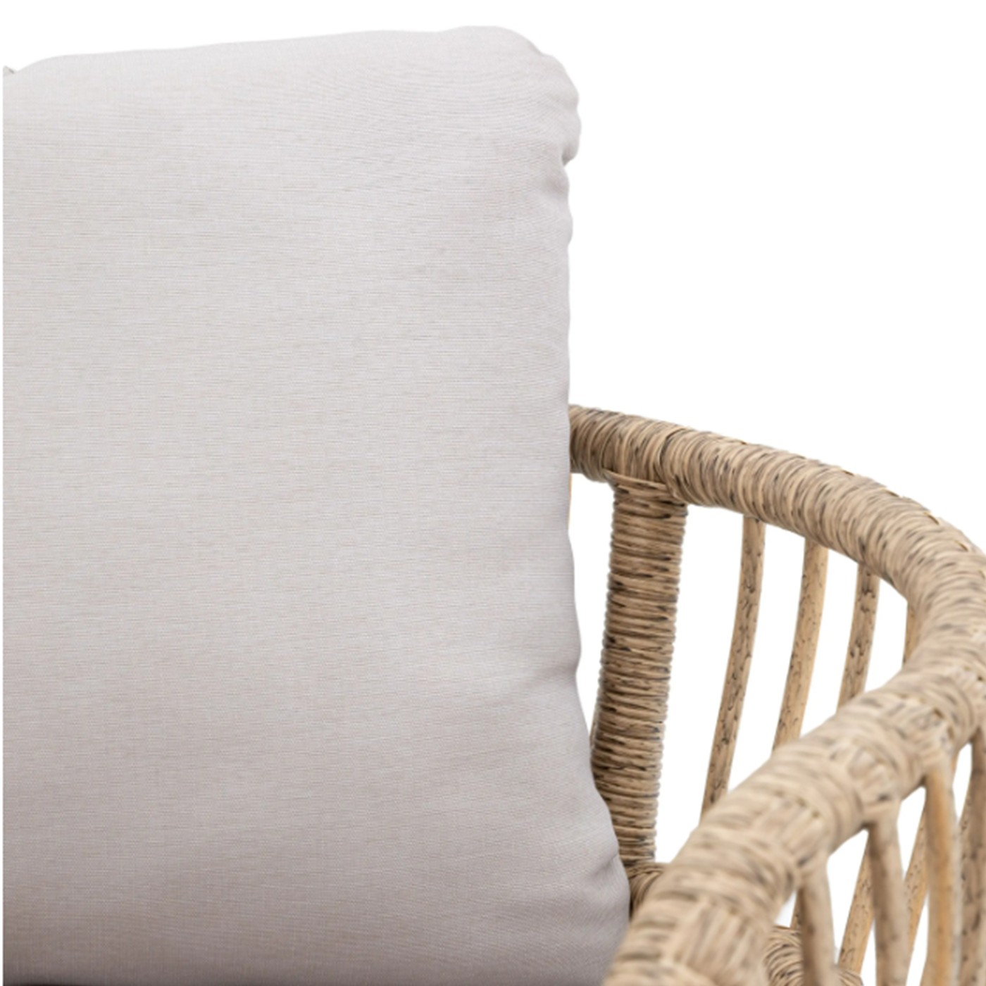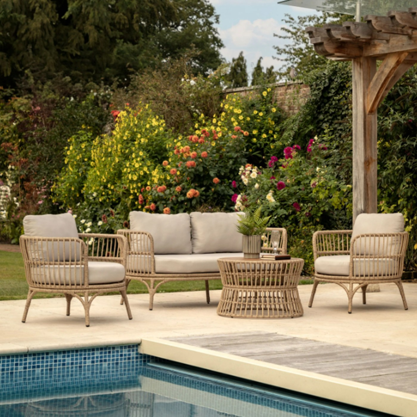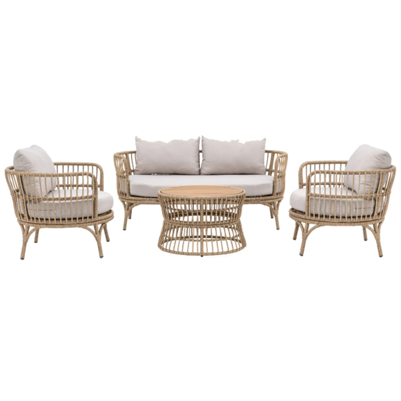 Boho inspired for the ultimate chilled out summer this lounge set features 2 stunning woven look armchairs, a 2 seater sofa and a round Acacia wood topped coffee table. The steel frames are wrapped with 9mm brown weaving for a natural look that will last outdoors, added comfort comes from the soft grey UKFR foam cushions.