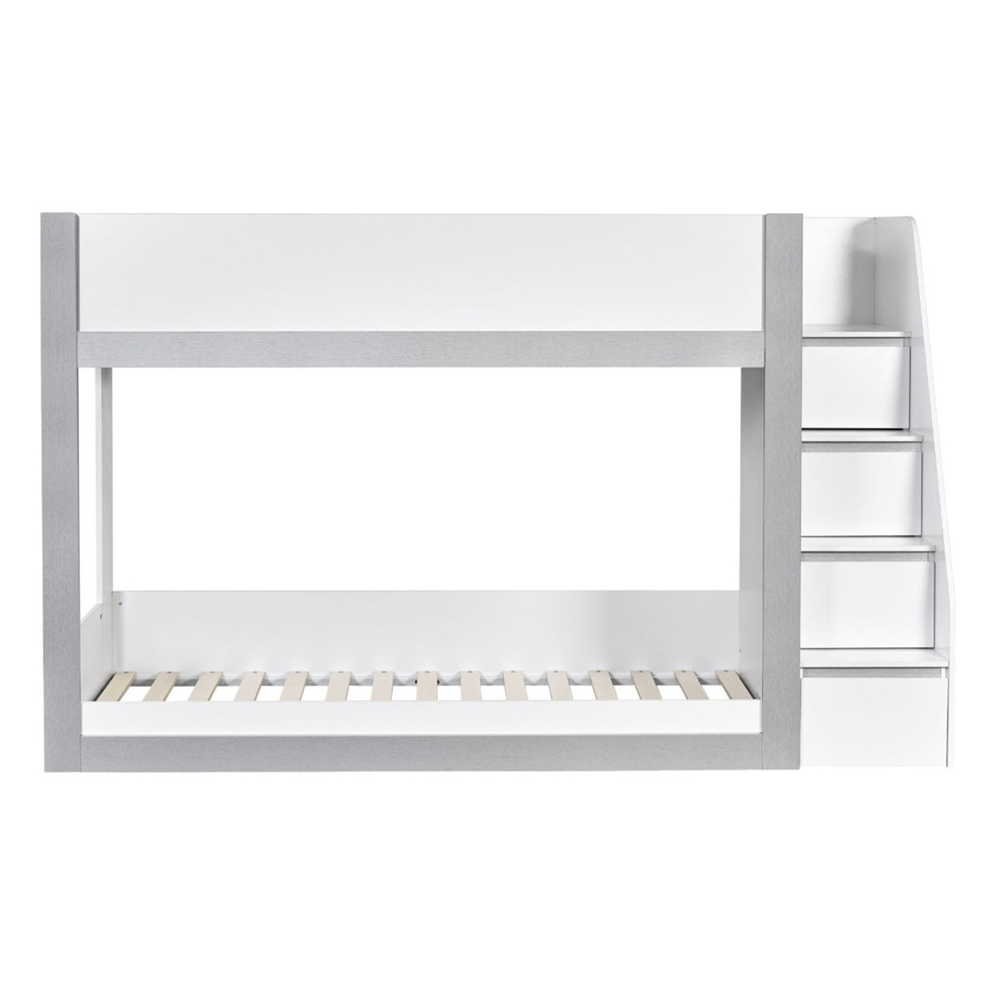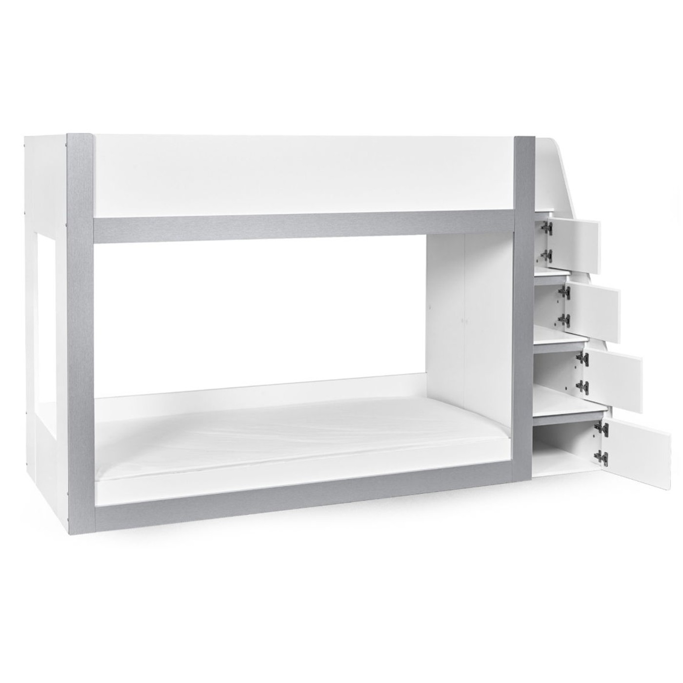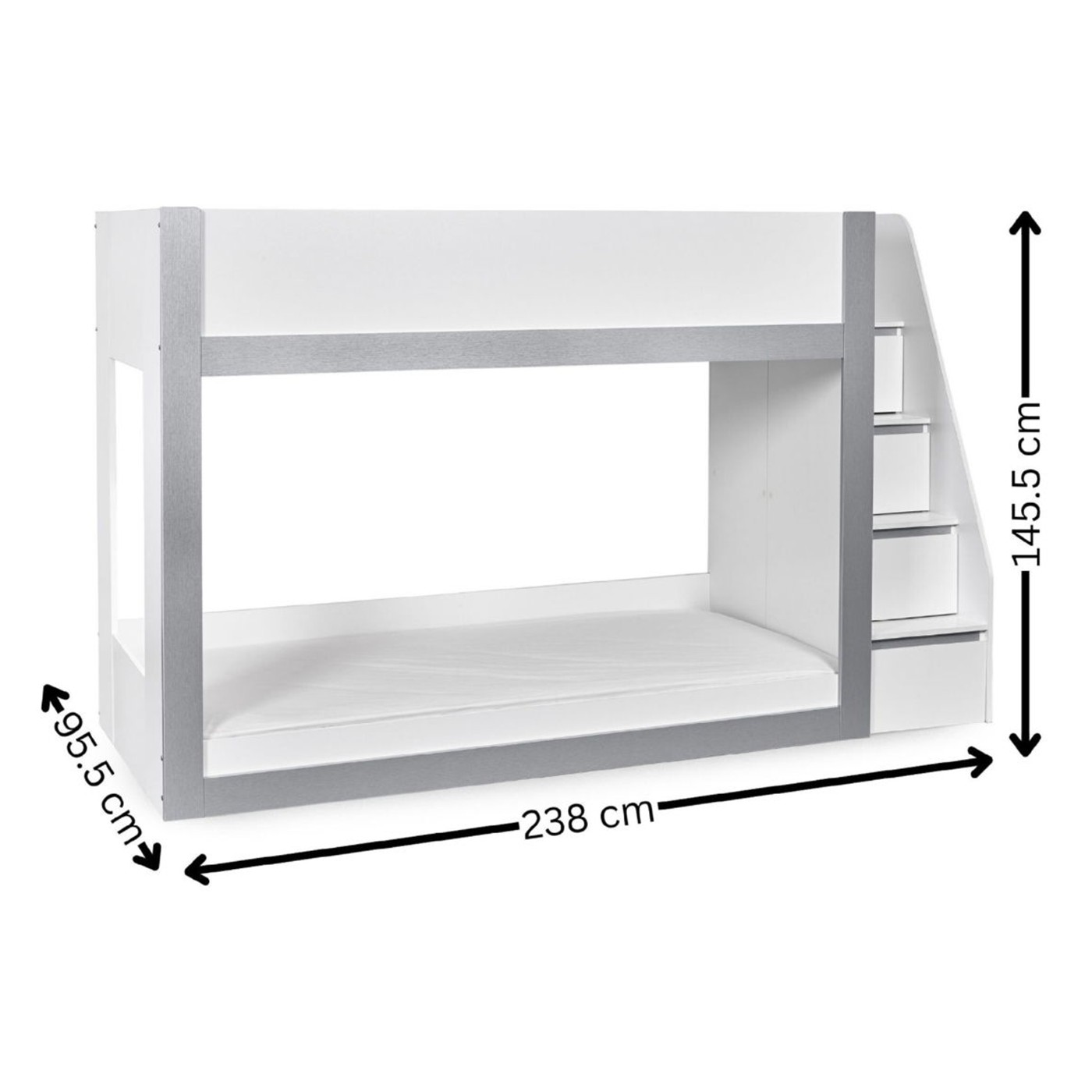 Transform your child’s bedroom with this extraordinary bunk bed, designed to bring modern style and practical storage into their space. With a sleek white and silver finish, this contemporary single bunk bed offers a clean, fresh look that complements any kids’ room. The fixed ladder provides safe access to the top bunk and features integrated storage compartments, ideal for keeping books, toys or daily essentials neatly organised. Crafted from strong, durable wood, this bunkbed is a smart, space-saving choice for shared bedrooms or sleepovers. Mattresses sold separately.