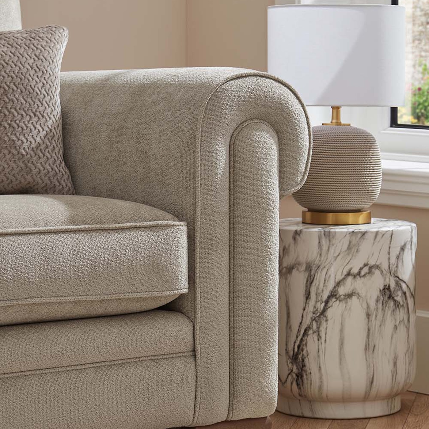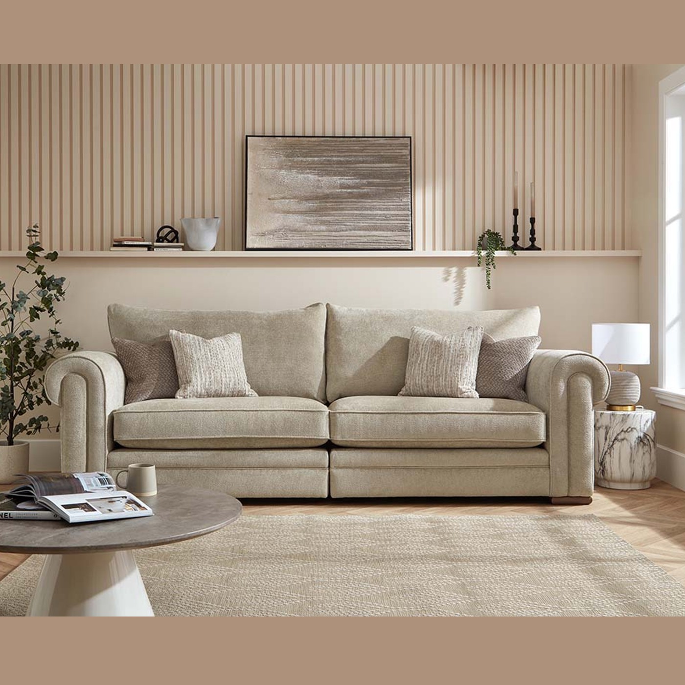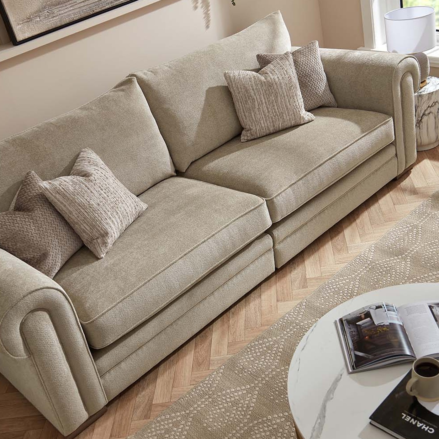 This sofa creates a refreshed look with a trusted scroll arm design, offering a dramatic yet familiar feel. A style that remains a timeless icon within the sofa landscape, this classic design features elegant self-piping to accentuate the grand curves of the scroll arms.